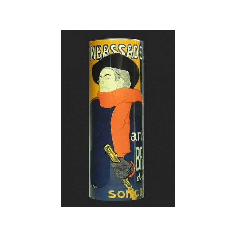 h. 18 cm. / Ø 6 cm. TOULOUSE -LAUTRECAristide Bruant dans son cabaret (1893)En raison de son handicap, il boitait, et de sa petite taille, la traditionnelle carrière militaire n'était pas envisageable pour le jeune comte de Toulouse -Lautrec. Il se sentait chez lui à Montmartre, qui débordait d'humour et d'ironie fin -de -siècle, de fêtes et de bals masqués. Pour le cabaret Le Mirliton du chanteur Aristide Bruant il réalisa des peintures murales et couvertures de revues. Ce fut toutefois l'affiche pour Le Moulin Rouge qui le rendit célèbre du jour au lendemain.